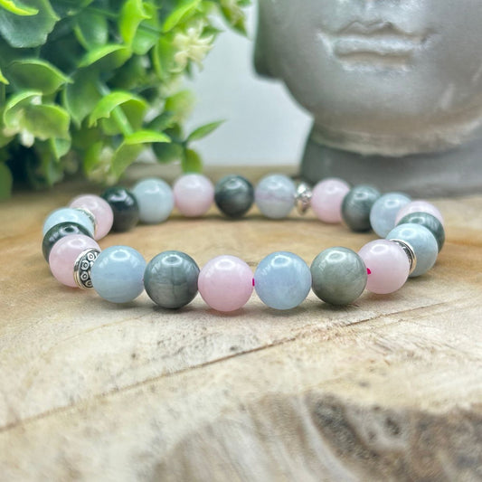 Bracelet 8mm - Aigue-Marine, Quartz rose et Œil de Faucon